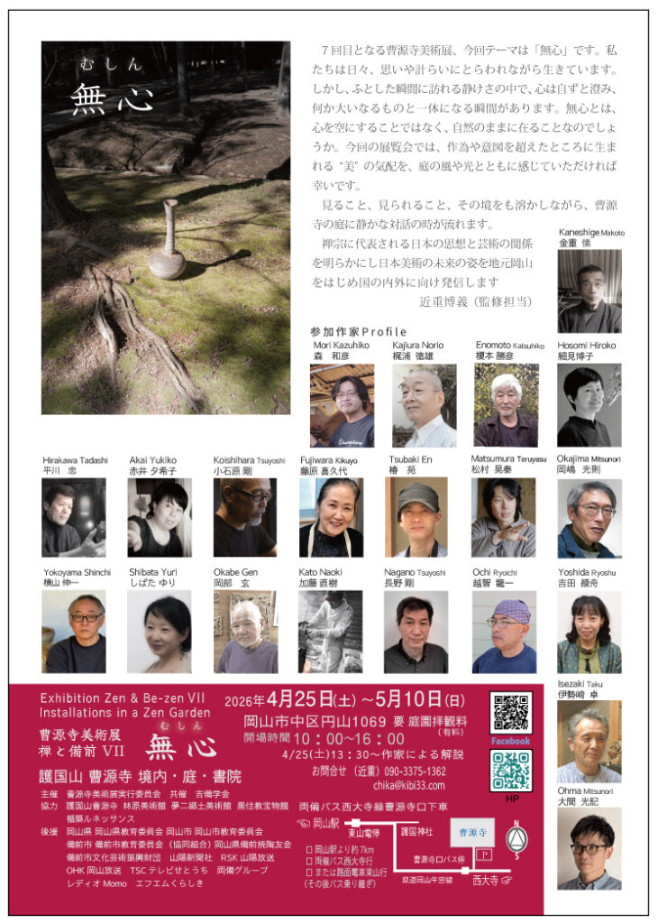 (備前陶芸)金重 愫 平川 忠 赤井夕希子 森和彦 横山伸一 藤原喜久代 伊勢崎卓 越智 龍一  (現代美術)岡部 玄 梶浦徳雄 しばたゆり 小石原剛 長野剛 椿 苑 (セラミック) 加藤直樹 (彫刻木漆芸)榎本勝彦 (金属・ガラス造形)細見博子  (書道)吉田綾舟